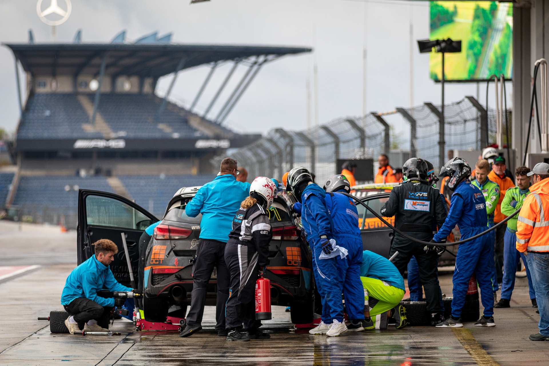 Bereits beim zweistündigen Zeittraining am Samstagvormittag zeigte sich das Eifelwetter einmal mehr als launisch und zeitweise fiel leichter Regen. Unbeirrt davon konnte der WWS-Hyundai #491 von der Pole Position der Klasse VT2-FWD für seriennahe frontgetriebene Wagen mit 2-Liter Turbomotor ins Rennen gehen. Die Startampel gab dann um 14:30 Uhr die Hatz frei, bereits in der Startaufstellung gab es die ersten Reifenpoker da dunkle Wolken über der Strecke lagen und erste Tropfen fielen. Über den gesamten ersten Teil setzten dann teilweise starke Schauer ein und in den Boxen herrschte ständig reges Treiben, jeglicher Taktikplan wurde immer wieder zunichte gemacht.